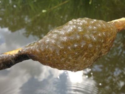 If you are swimming and bump into what looks like a brain from Saturn don’t get freaked out because it is just a harmless bryozoan colony. Freshwater bryozoans live in colonies which can get as big as a basketball. A new colony will start from larva or from statoblasts which are like seeds. Bryozoans are water animals so that means they eat and digest tiny animals like plankton by filtering them out of the water. Each bryozoan is about 1 mm long. They are often found attached to objects, but can be found free floating as well. They form a translucent body with many star-like blooms along the outside. The density of the organism is similar to that of gelatin, and is easily breakable into smaller chunks. This group was found on the edge of the water at the board walk.