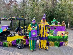 Krewe of Palmetto held the 7th annual Mardi Gras Golf Cart Parade on February 20 at Palmetto Island State Park. Organizers would like to thank all of the dedicated participants who come out every year. They are inviting more riders to make 2025 'one of the best and biggest State Parks' parades'. Next years parade will be held on **March 1, 2025**. This year's theme was Sparkle in Denim and Diamonds, 27 golf carts took part and 30 campsites received door prizes. Friends of Palmetto would like to thank Shawn, Christine and the rest of the Krewe for putting this event together.