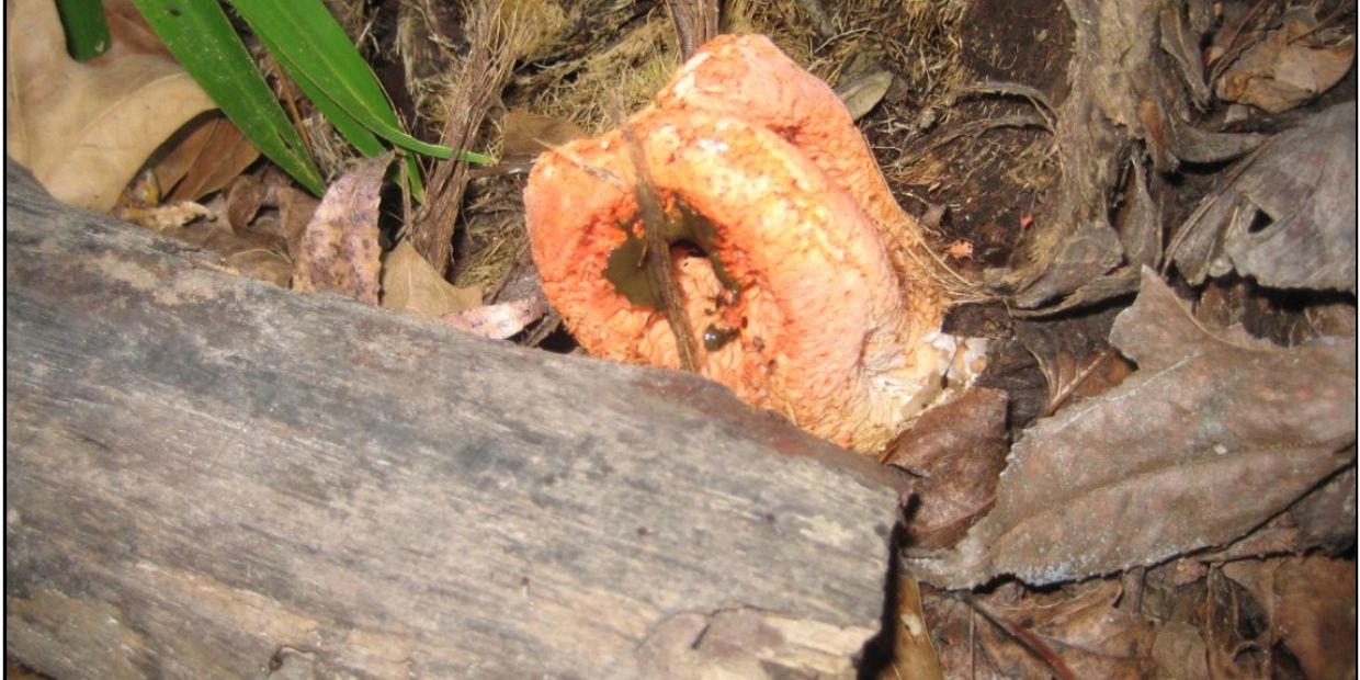 Along with the cold weather comes the emergence of the stinkhorn mushrooms. Although many species exist, Palmetto Island State Park has been blessed with the presence of Clathrus columnatus, the Columned Stinkhorn. The mushroom begins its life as a small white sac, but soon pinkish to reddish orange arms emerge rising vertically and then attaching at the top creating a roof like structure. Under this roof is housed the foul smelling olive green slime where the spores are located. The mushroom lures in insects with its pungent aroma plastering them with slime and thereby spreading its spores to new areas. Columned Stinkhorns grow on or near woody debris from October through March. Try to locate them along the hiking trails by sight or smell.